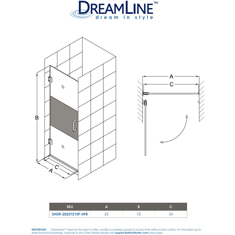 DreamLine Unidoor 72" High x 25" Wide Hinged Frameless Shower Door with Frosted Glass