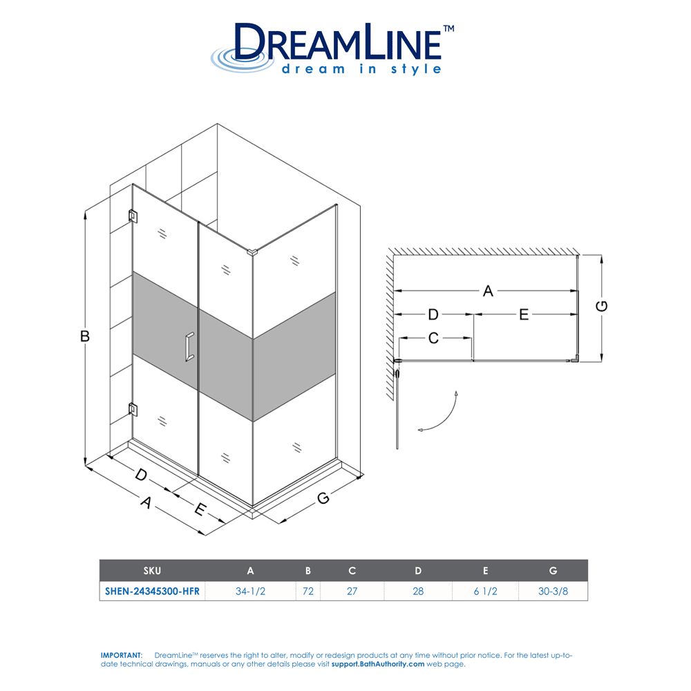DreamLine Unidoor Plus 72" High x 34-1/2" Wide x 30-3/8" Deep Hinged Frameless Shower Enclosure with Frosted Glass